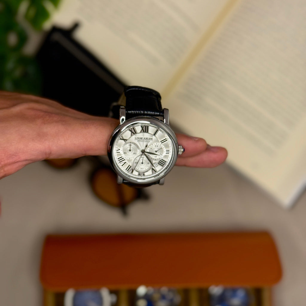 Construído inteiramente em Aço inox com mostrador em vidro em Hardlex e couro legítimo.
